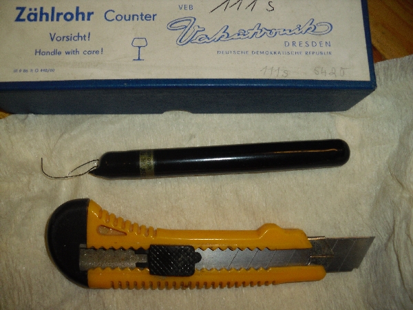 counter tubes: A main criteria of counter tubes is the "active area" of the tube. Quite reasonable, the bigger an area the higher the probability that a radiation quantum finds its way through it and is being detected. The tubes listed here are all bigger than those usually used in handheld radiation detectors. Another important criteria is the wall thickness or -density. Also quite clear because the radiation quantum to be measured must pass through this wall. While high energy gamma rays also penetrate steel walls, beta radiation passes glass you need very thin windowed window counter tubes to measure alpha radiation. By chosing the proper counter tube material you can influence the spectral response of a counter tube. Wall thickness is usually given in "weight per cm2", usually in mg/cm2. Standard handheld geigercounterubes have wall thicknesses in the region of 100mg/cm2, alpha-detecting tubes have windows in the weight region of 1-3 mg/cm2. No need to mention that those thin windows are extremely fragile and to be treated with very very very much care... |
